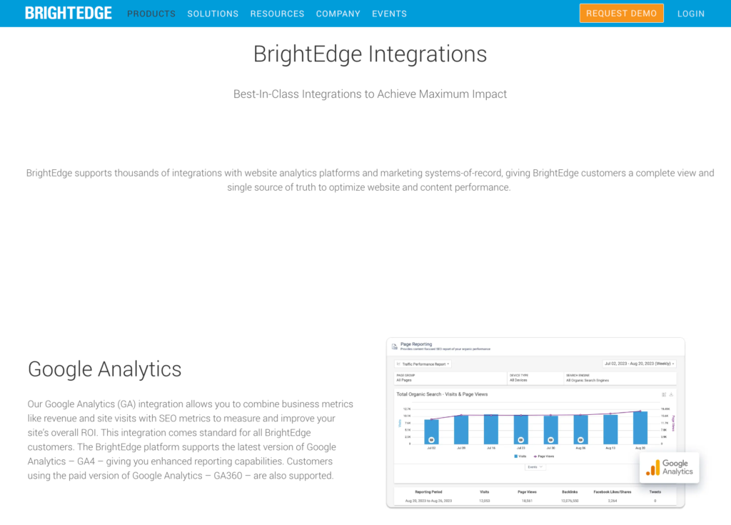 BrightEdge integrates with thousands of third-party apps. However, it’s still much less than Semrush. For example, BrightEdge doesn’t allow social networks or third-party partner integration. In any case, it easily connects with Google Analytics, Looker Studio, Majestic, Web Trends, Adobe Analytics, etc.