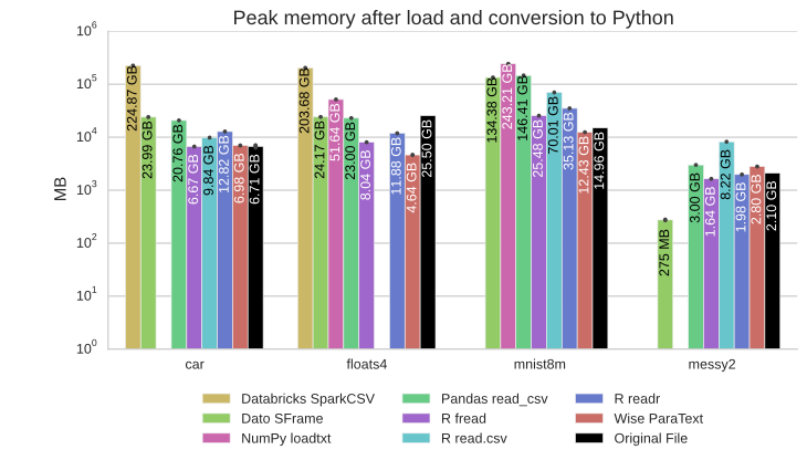 ParaText had the lowest overall memory footprint. Dato SFrame had very low memory usage on text data as long as the data frame stayed in Dato’s kernel. Spark reserves a large heap up-front. It is therefore difficult to make claims about its memory efficiency to better inform how to provision resources for Spark jobs.